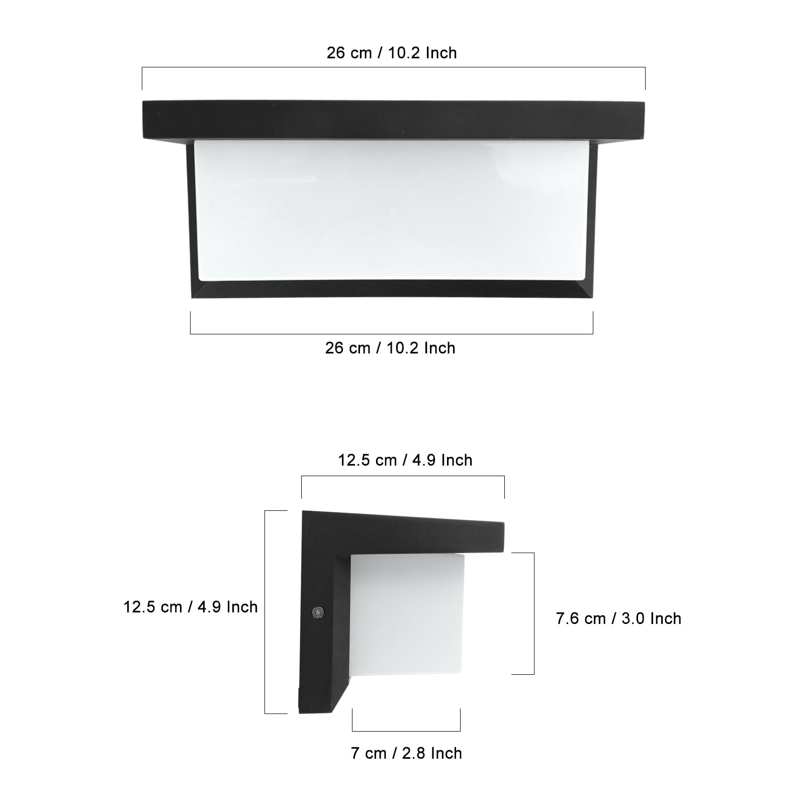 - Outdoor Waterproof Wall Light: 4.9’’(W)*4.9’’(H)*10.2’’(L) inches, the chassis panel, waterproof ring, high translucent acrylic and aluminum housing are combined in layers; These designs make the light have good sealing and solid durability; All of this provides good installation conditions for outdoor environments