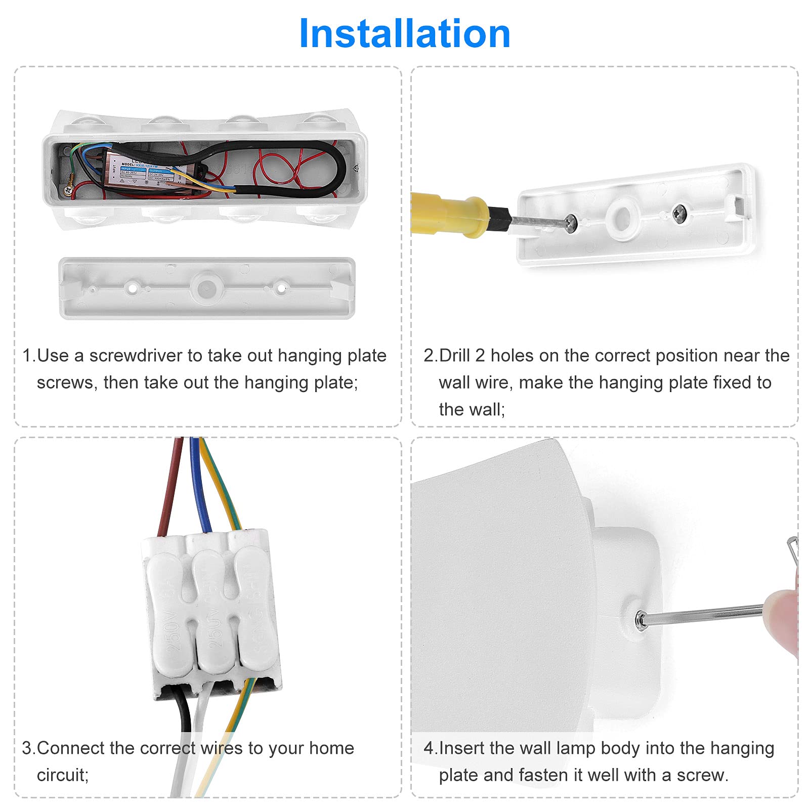 3.To ensure safety, you'd better let someone who have enough Electricity knowledge to install this wall lamp